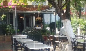 Met de bus werden we naar ons hotel gebracht. De bus zat vol en de eerste stop was Royal Nydri. Tot onze verbazing stapte iedereen uit. En als ik zeg iedereen dan bedoel ik ook iedereen. Alleen wij bleven over. Wat een drukte dus voor Royal Nydri. Na vijf minuten stopte de bus voor ons en kwamen we aan bij ons hotel George.