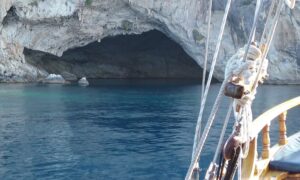 Ook zijn we bij de een na grootste grot van Griekenland gevaren en dat was best indrukwekkend. Met een kleine boot kun je door deze grot varen om aan de andere kant er weer uit te komen.