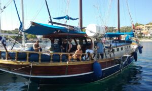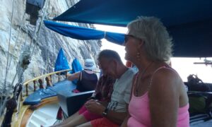Wij hadden vorige week al een boottrip geboekt en Rogier kon mee maar wilde toch het eiland op zijn manier verkennen. Dus ’s morgens in alle vroegte (8.30 uur) gingen wij op weg naar de haven om in te schepen op MS Christina. Weer een dag op het water dus. Maar het was een hele andere dag dan gisteren. Een mooi schip met alle faciliteiten aan boord.
