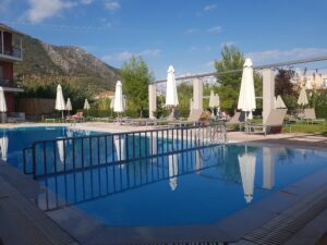 Een gezellig klein complex, met een gezellig terras met restaurant, mooi zwembad en wij werden naar onze kamer gebracht. Klein maar simpel. Maar wel met een terrasje met uitzicht op het zwembad.