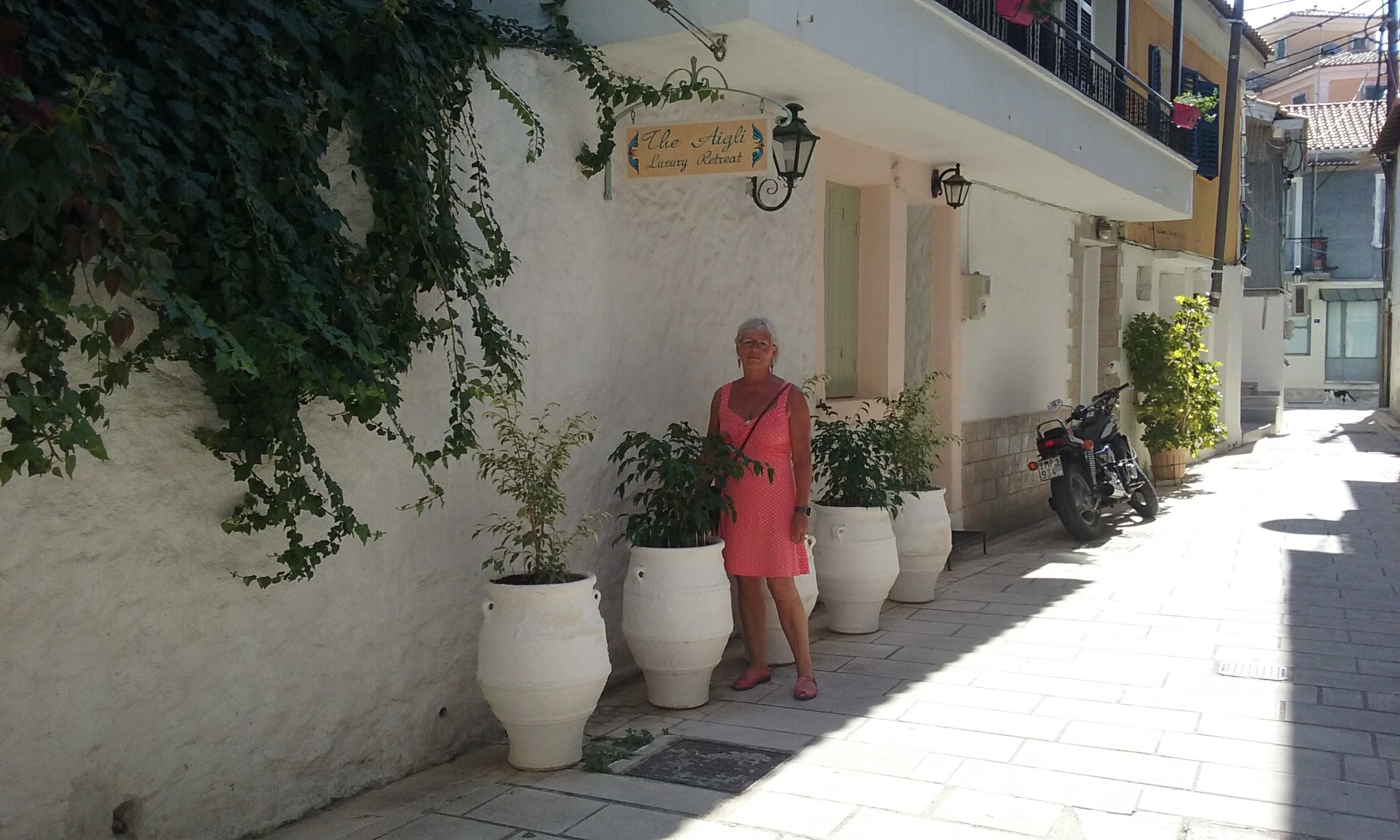 Wat een leuk plaatsje. We hebben koffie gedronken op een leuk pleintje met een enorme grote crêpe met slagroom. Daarna door het stadje gelopen. Wat soeveniertjes gekocht en op naar Parga. Helaas Parga hebben we niet kunnen vinden. Alle namen staan in het Grieks op de borden. Toen maar weer teruggereden naar ons eiland en zijn we aan de westkust beland. Wat een mooie route hebben we gedaan. Prachtige zandstranden en mooie wegen door het berglandschap.