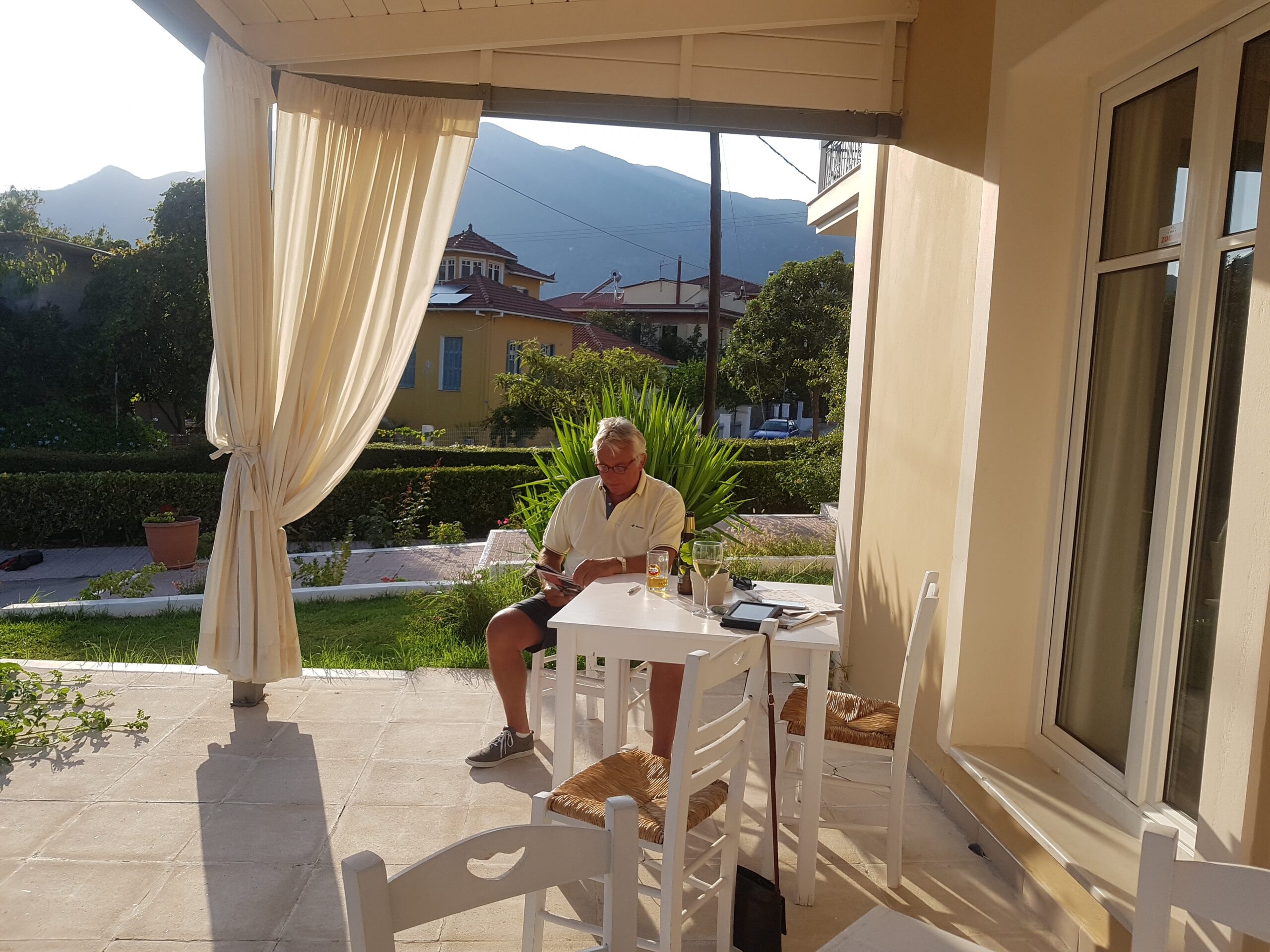 Opstaan met een behoorlijk bewolkte lucht. Komen we hiervoor nou naar Griekenland? De temperatuur is trouwens heerlijk niet te warm. Na het ontbijt op ons balkon een beetje lezen en genieten.